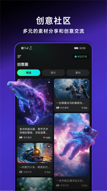 通过“创意圈”社区实现创作者灵感共享,用户可一键复现热门作品模板;