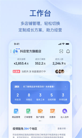 抖店app最新版是一款由字节跳动官方推出的电商商家一站式移动工作台,专为抖音生态内的线上店铺经营者提供全链路数字化管理解决方案。这款抖店app最新版深度整合了商品运营、订单处理、客户服务、数据分析等核心功能,支持商家在移动端完成90%以上的店铺管理操作,是连接6亿日活流量与千万级电商从业者的核心工具。通过绑定抖音、头条、西瓜视频等多渠道账号,商家可实现商品信息跨平台同步、精准流量获取及高效转化,尤其适合中小型商家快速布局兴趣电商赛道。