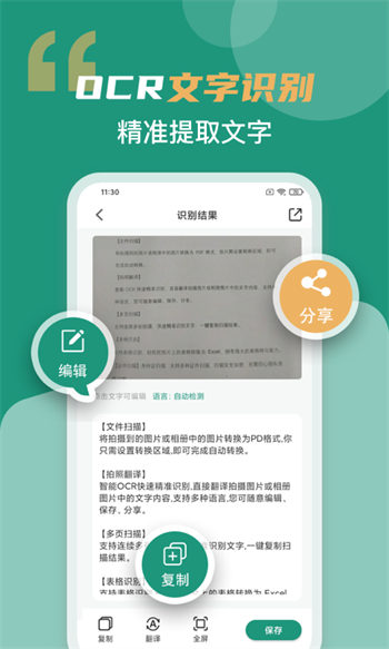采用前沿图像识别技术,自动检测文档边界并优化背景,生成无杂点的扫描件。支持长图、多栏排版识别,准确率高达99.9%,可快速将手写或印刷文字转化为可编辑文本,满足合同条款、书籍章节等复杂内容的数字化需求。