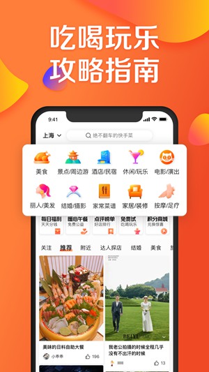 1. 大众点评覆盖吃喝玩乐、美食优惠、好店推荐、外卖订餐、酒店门票、旅游攻略、电影票预定、团购信息等!除此之外,还提供本地生活服务,如休闲娱乐KTV、亲子、美发、医学美容、结婚摄影、健身运动等,贴心周到的上门服务包括,"家庭保洁、保姆陪护、家电维修、搬家、宠物"等等。