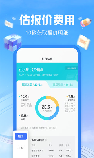 住小帮最新版本是一款家具装修必备的软件,这里有着非常靠谱的服务,各种装修的样式都能够直接在这里看到,还能够根据自己的想法来预估装修所要花费的费用。住小帮最新版本能够根据用户自己喜欢的装修样式来测试出装修的风格,还有着装修百科能够了解,就算你是一个小白也能够快速避开各种坑。住小帮最新版本中有着非常简洁的界面,可以在这里定制属于自己的装修方式,这里有着非常全面的装修流程,无论是水电、泥瓦、厨卫还是软装都能够在这里看到,更是有着专属的交流圈,能够看到其他用户的装修心得。快来下载体验一下吧。