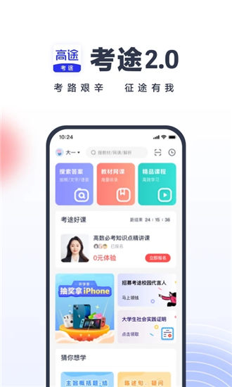 考途最新版是一款非常受欢迎的大学教材网课作业备考神器软件,这款软件界面简洁,内容丰富,拥有海量的学习资料等你来获取,汇聚了丰富的教材网课,可以更好的满足不同用户的学习需求,超多精品课程等你来学习。考途最新版拥有非常强大的搜题功能等你来使用,拍照搜题,语音搜题,文本搜题等多种搜题方式等你来使用,帮助用户更加快速的找到想要的答案,享受更好的学习辅导服务。考途最新版还有超多升学考编资料等你来获取,考研,考公,英语四六级以及多种证书的备考资料一应俱全,用户可以随时打开软件来进行学习,喜欢的话千万不要错过,感兴趣的用户快来下载体验。