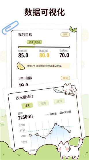 3.你可以记录饮食、记录饮水量、记录体重、记录身体状态,一步一步见证你蜕变逆袭的过程!