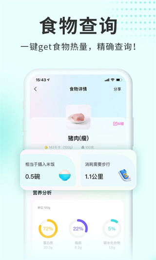 饮食记录,运动消耗打卡,各种营养素摄入比例一目了然,更有周、月、年度的数据曲线报告,直观体现对减肥更有帮助!