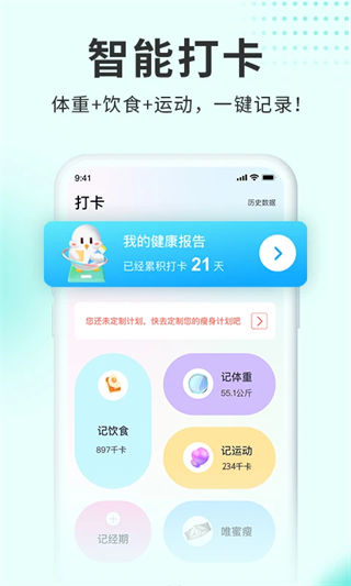 智能打卡,超便捷,体重+饮食数据一目了然