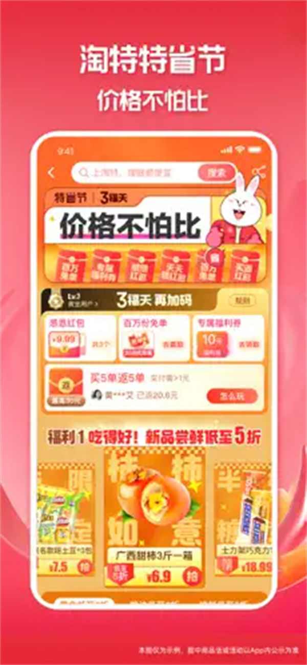 淘特官方版是一款为广大用户量身定做的掌上购物商城,其中每天都有最新、最优惠的商品供用户筛选,这里的商品都比其他平台便宜很多,有质量保证,支持7天无理由退款,做到真正保证用户的消费者权益,淘特官方版商品的种类也相当的丰富,如生鲜、电器、化妆品、美食、服装等样样俱全,淘特官方版不仅数量多,而且在用户购买的时候还能提供最极致的服务,有专属的快递配送路线,今天买明天就能到的物流速度,实现比市面上都快的运输效率,软件每天还会和用户推荐你可能喜欢的商品,都是根据你的经常浏览的产品筛选而出。