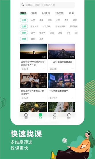 2.国内外名校公开课、泛知识视频、精选播客频道,不同形式的知识内容,配合你不同学习阶段的需求。