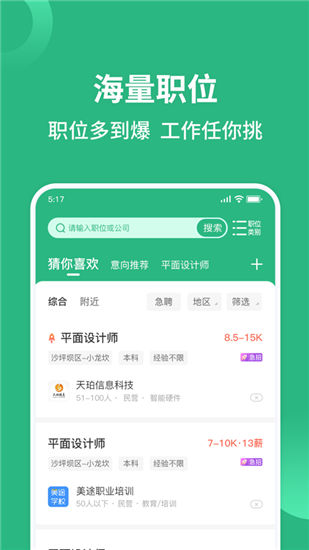 1.【附近的工作】按您的居住地寻找心仪企业及职位,从此不再怕迟到。