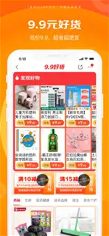 4、9.9元拼:每天精选百余款好货,覆盖食品、母婴、服饰、家居、数码等十多种品类。9.9元封顶!高性价比!更享包邮到家福利~