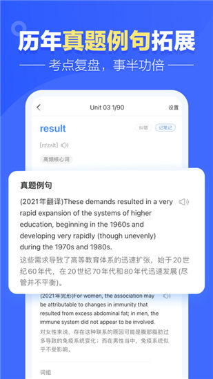 2.乐词依靠新东方教研力量,将英语单词在考试中常用的解释列举出来,配合发音、配图及真题例句,将英语单词解析呈现出来,让大家轻松地背单词!
