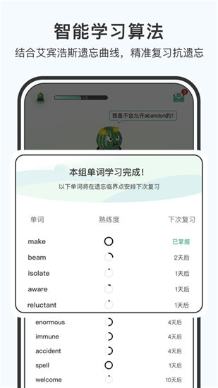 1.科学记忆法解决单词背了又忘的困扰,纯净极简的学习氛围让你专心高效背词。
