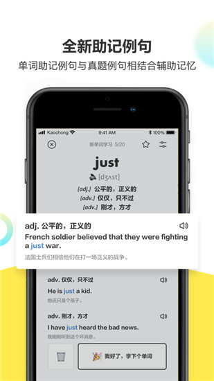 3.在学习过程中搭配有精心撰写、筛选的助记与真题例句。助记例句可帮助考生直观快速理解词义,提升记忆效率。真题例句可让考生迅速了解该词在考研真题中的考法,了解真题原貌。成功做到在快速记忆背单词的同时,更能提升真题语感。