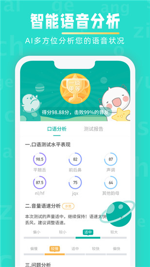 2.软件采用先进人工智能测评技术,对你的普通话发音进行评分,帮你找出错误发音。针对性纠正,有效提高普通话水平。