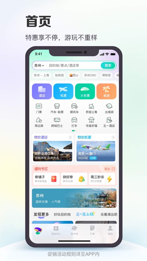 2.门票:全国海量景点优惠订,特价门票5折起;极速出票快乐游,免票入园不排队,无忧退订有保障;支持在线预约,无接触式购票安心游!