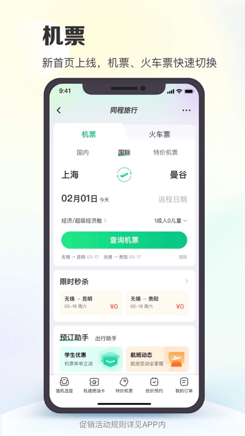 1.机票:特价机票天天有,最低1折起;价格透明,大额优惠券天天领;免费选座,在线值机,随时掌控航班最新状态;线上退改更便捷,退改签不收取额外费用。