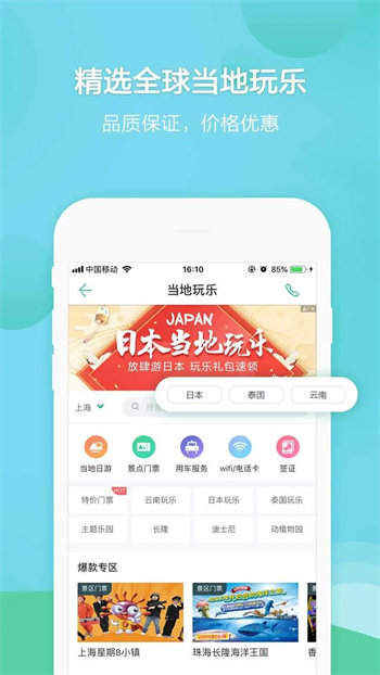 出境游,可根据出发地、行程天数、旅行目的地进行选择,快速查询目的地旅游信息,快速办理签证、安排行程