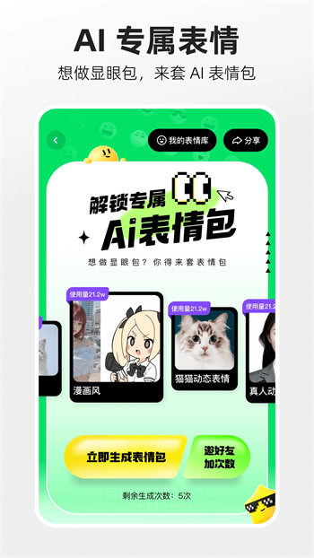 在这里,你可以把宠物、朋友、恋人、老板、爱豆都作为你的创作素材和对象,创造专属于你的表情包,动漫风、浮夸风、人脸动态化、宠物动态化,只要你的素材足够多,你就是表情包梗图制作人