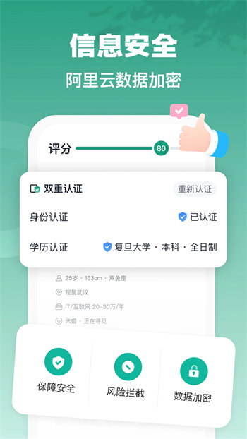 所有用户均需通过实名和学历双重认证才能进行互动,每一次提交相册和资料都会经过后台人工严格审核,真实、丰富,让你更了解Ta!