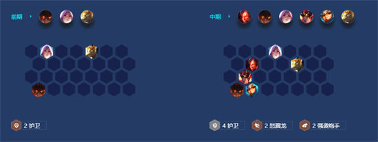 而本套阵容的核心运营思路在于3-1阶段快速搜到三星赛娜和一张低费卡护卫后转连胜路线上人口,后续就是补开四护卫和四强袭炮手,如果可以升到九人口可以补巴德和索拉卡或者用二星泰拉+二护卫作为阵容前排,需要注意的是面对龙神阵容以及刺客阵容会大概率被暴打。