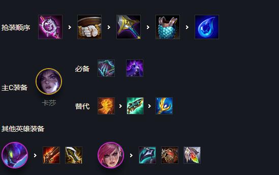 主C卡莎:装备给上鬼书,夜之锋刃,正义备选法爆,大帽,巨杀,大天使。