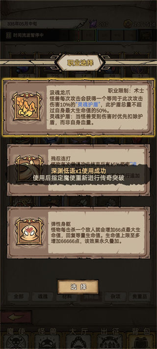 传奇技能术士选汲魂龙爪,其他职业技能随便选,后期随便选一个使魔带愉悦演出回热情
