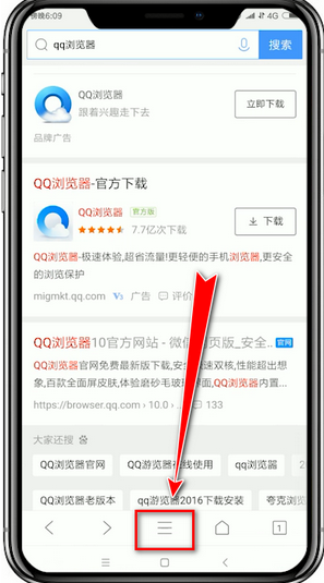 1、首先打开QQ浏览器app,点击界面下方的三条横线;