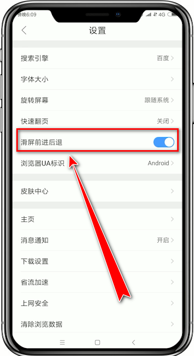 3、点击【滑屏前进后退】后面的按钮,将其由蓝色点击成灰色即可关闭滑屏前进后退功能。