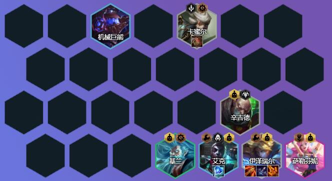棋子组成:卡蜜尔、辛吉德、伊泽瑞尔、基兰、艾克、奥莉安娜、萨勒芬妮、烬