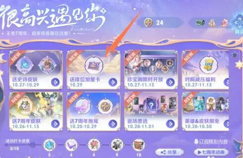 王者荣耀七周年活动,在10月29日当天登录游戏,在活动界面就可以直接领取一张排位加星卡。