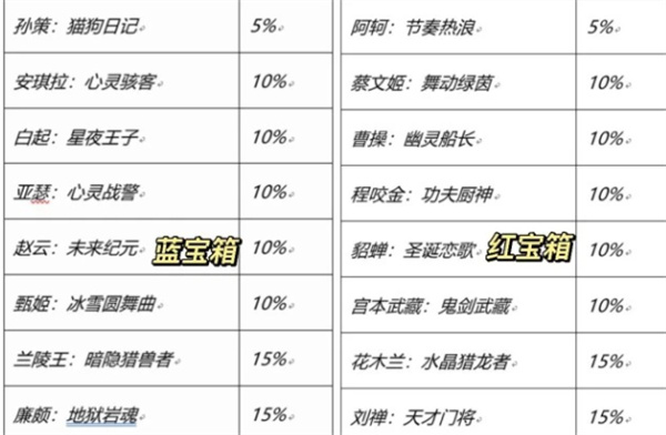 10%概率的有程咬金功夫厨神、蔡文姬舞动绿茵、貂蝉圣诞恋歌、曹操幽灵船长、宫本武藏鬼剑武藏
