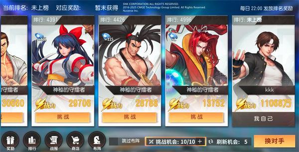 “格斗竞技”模式,经纪人自行挑选对手,可以刷新五次,挑战十次,根据击败的敌人,来提升排名,低排名大多是AI,难度较低,很容易打,但是奖励非常丰厚,可以获得大量钻石,俗“挖矿”。争取到排名之后,在晚上22:00还会发放排名奖励,荣誉与徽记,可以在竞技商店中兑换专属道具。