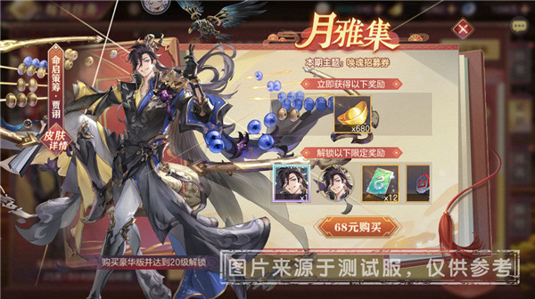 同时每月将有一款史诗级武将皮肤载入月雅集,68元付费解锁“月雅集豪华版”并达到20级即可获取,还有本期限定招募券、海量资源等你来领!