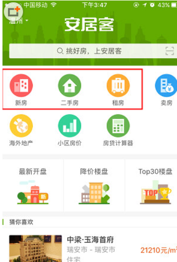 1、首先打开安居客APP,在首先选择“新房”、“二手房”、“租房”任意一个;