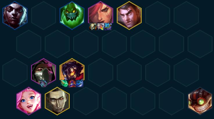 后期变阵4-5拉八,根据场上情况考虑是大搜提升质量还是直接隐忍上九,搜卡优先保证阵容质量,维克托只要来了一张就可以考虑上九搜二星,如果运气实在是不好就转格斗烈娜塔优先保分。除了维克托其他五星卡都有下位替代,塔姆—蔚,金克丝—艾克,希尔科—婕拉,杰斯—猪妹,根据来牌慢慢替换即可。