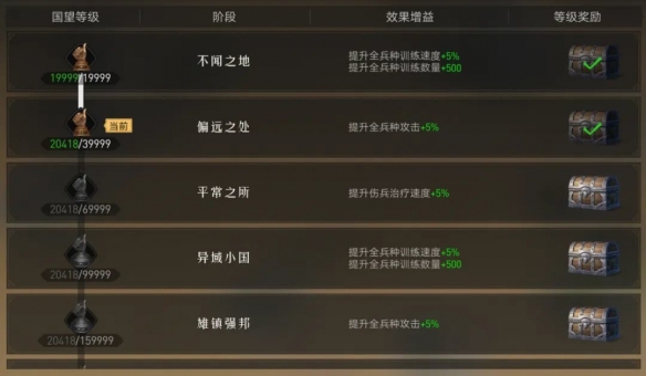建立帝国后,将会解锁国望功能,帝国的国望级别提升,将会获得大量资源奖励以及各方面的属性增益效果。