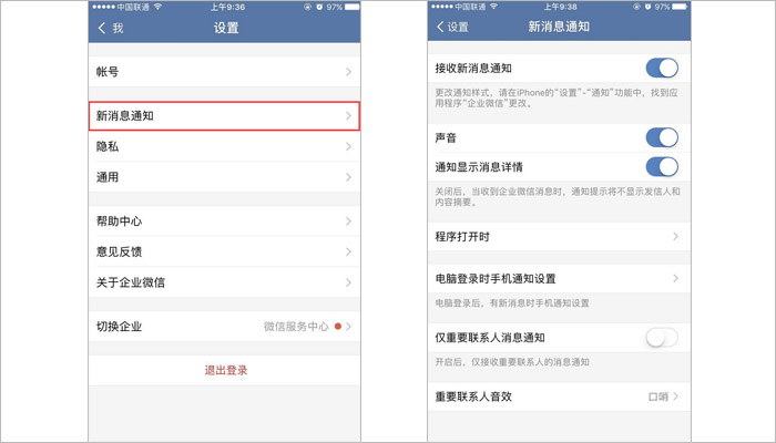 1、请检查【企业微信】->【设置】->【新消息通知】,消息提醒设置是否打开,是否启动有仅启动重要联系人提醒。
