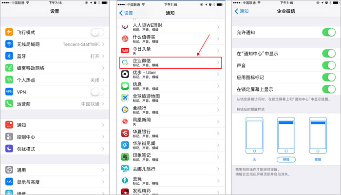 2、iOS系统设置,【设置】->【通知】->【企业微信】,开启允许通知。
