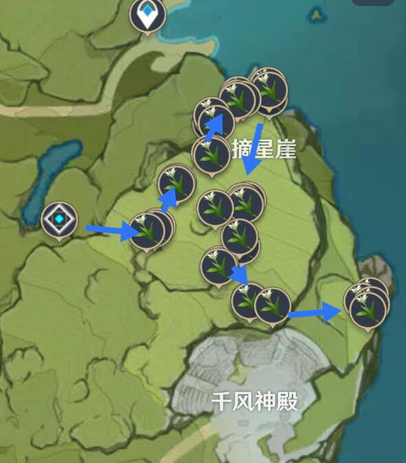 (塞西莉亚花都是几朵一起的,按这个路线可以拿完)PS:晚上来摘星崖采花还会遇见两位NPC在那看风景