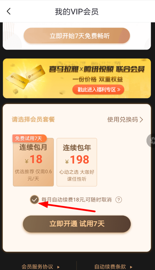 2、在办理vip会员的时候,通过点击取消勾选的“每月自动续费18元”选项,这样办理会员后就不会每月自动续费了。