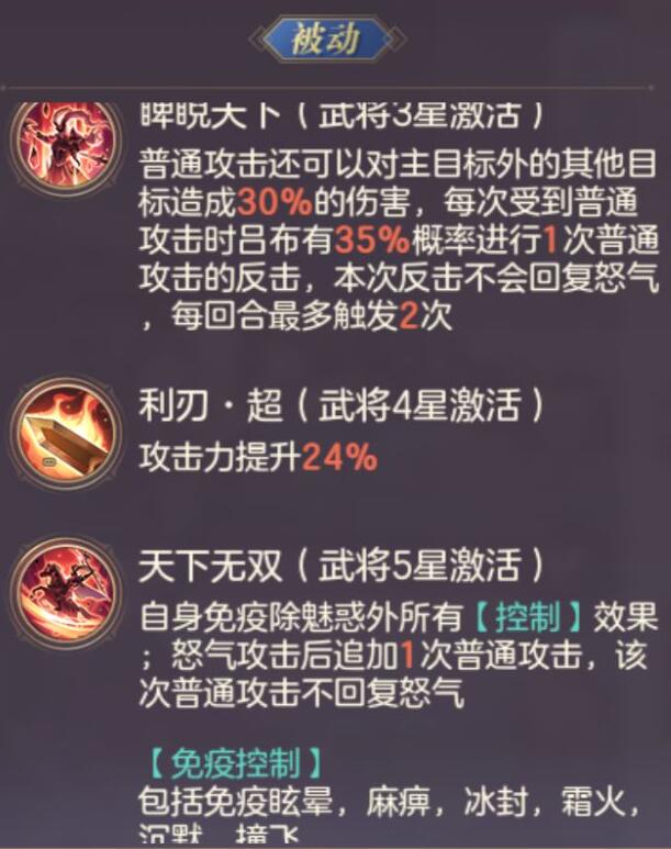 首先“业火”在判定上等同于“灼烧”,因此可以与本技能发生联动。这个效果能够为我方提供1回合/次的高额普攻伤害加成,而且具备非常可观的增幅系数,同时很明显也是为了配合普攻型武将,但是最大的限制在于增幅次数只有一次,这就对单次普攻的基础伤害提出了要求,而且“需要先释放怒攻”的限制条件也使得姜维无法享受加成,吕布是目前最适合本效果的武将,但是吕布的单次普攻伤害明显还不足以一击致命。