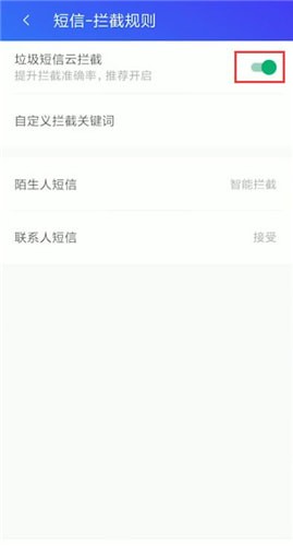 点击短信拦截规则,将垃圾短信云拦截选项关闭,
