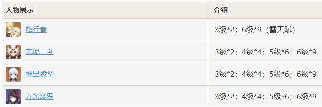 旅行者(雷)、荒泷一斗、神里绫华、九条裟罗