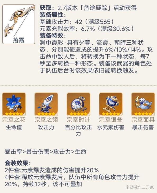 前期的夜兰属性方面并没有多出色,可以选择用充能武器提高大招的触发频率,提升输出,圣遗物方面,作为以大招为主要输出的辅C/主C,宗室套相较其他圣遗物,能发挥更大的作用;