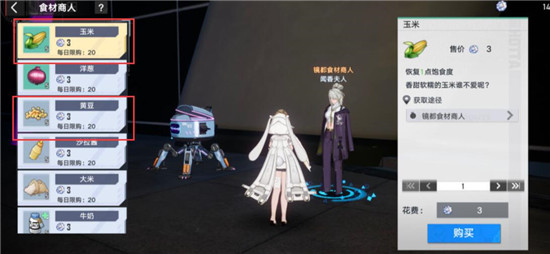 首先我们前往镜都的接待处,径直走到尽头右转就可以看到闻香夫人,在这里我们可以购买到黄豆和玉米,大家节约购买,因为目前镜元币还是很稀缺的。