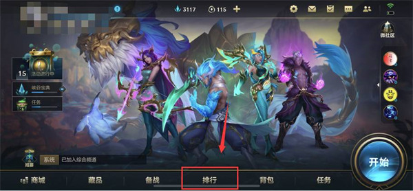 1.先打开英雄联盟手游,点击下方的排行按钮。