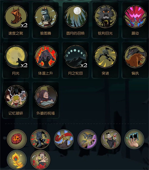 核心:月光(2-3张),体温上升,月轮(2-3张),偏执,可选(狼图腾,突进,鞋子,兽性激发祝福,锐利目光)