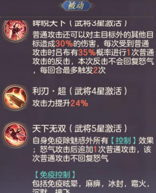 首先“业火”在判定上等同于“灼烧”,因此可以与本技能发生联动。这个效果能够为我方提供1回合/次的高额普攻伤害加成,而且具备非常可观的增幅系数,同时很明显也是为了配合普攻型武将,但是最大的限制在于增幅次数只有一次,这就对单次普攻的基础伤害提出了要求,而且“需要先释放怒攻”的限制条件也使得姜维无法享受加成,吕布是目前最适合本效果的武将,但是吕布的单次普攻伤害明显还不足以一击致命。