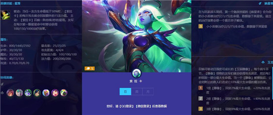被动:当任一友方生命值低于50%时,【索拉卡】的每次攻击就会回复额外的15法力值。 主动:【索拉卡】召唤一阵持续2秒的星雨。友军在每次被一颗星星命中时都会获得100/150/1000治疗效果。属性:生命:800/1440/2592暴击率:25/25/25