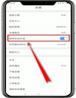 3、点击【滑屏前进后退】后面的按钮,将其由蓝色点击成灰色即可关闭滑屏前进后退功能。
