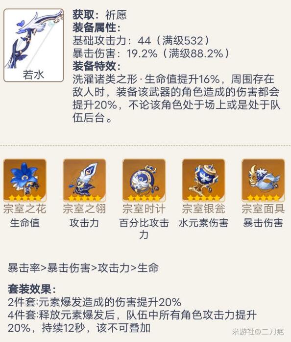宗室圣遗物推荐辅助向夜兰使用,也可以给副c角色进行使用,输出和辅助兼备,放完技能就立马切换下一个角色(主c)进行输出,另外如果偏主C的话,也可以尝试2水2宗室去搭配,武器方面,目前毫无争议的就是若水,虽然基础攻击力低了,但其他属性整体拔高许多;